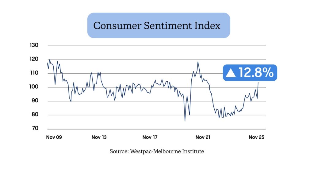 Westpac–墨尔本研究所 (Westpac-Melbourne Institute)的调查显示,十一月消费者情绪同比上升12.8%,标志着四年来首次出现“净正面”情绪,乐观者人数首次超过悲观者。